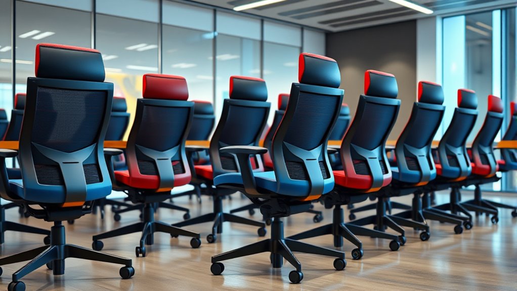 Choosing an ergonomic office chair with adjustable lumbar support is essential for maintaining proper spinal alignment and reducing discomfort during long hours at your desk. This feature allows you to customize the height, depth, or firmness to match your lower back’s natural curve, promoting better posture. Properly positioned lumbar support can cut lower back pain by up to 50% and ease muscle strain, making extended sitting more comfortable. Chairs with multiple height levels or movable pads offer a personalized fit for different body sizes and preferences. Some models even feature dynamic lumbar support that moves in real-time, adapting to your shifting posture for continuous ergonomic benefits. Overall, adjustable lumbar support helps prevent long-term back issues by supporting healthy sitting habits.