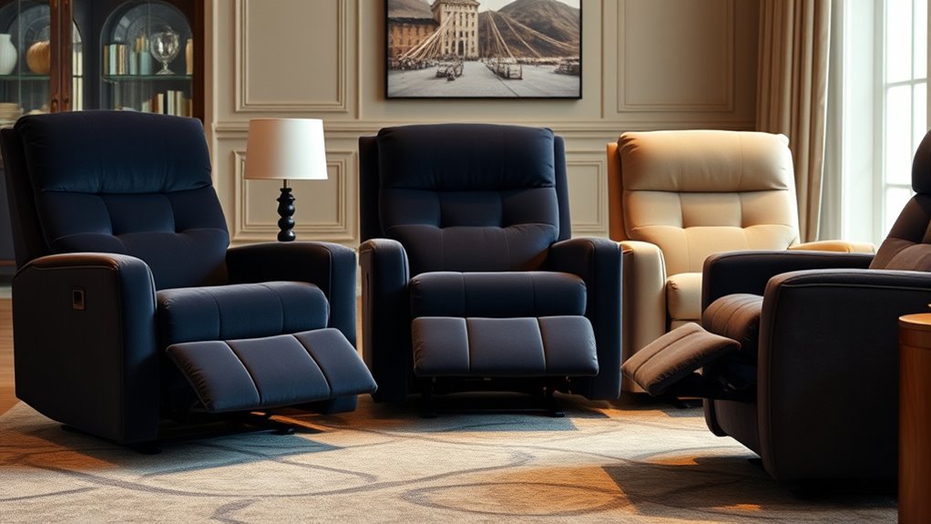 Since your recliner will become a key part of your decor, selecting a fabric that complements your existing furniture and room style is essential for a cohesive look. I recommend choosing neutral or versatile stain-resistant fabrics that easily blend with various color schemes and design themes. Pay attention to the fabric’s texture to ensure it matches your room’s tactile feel—whether smooth, plush, or textured. Matching the fabric’s style, such as modern, traditional, or casual, helps create visual harmony with your space. Also, consider the fabric’s sheen and colorfastness to ensure it maintains its appearance under your lighting conditions and over time. These choices will ensure your recliner enhances your decor without disrupting the overall aesthetic.