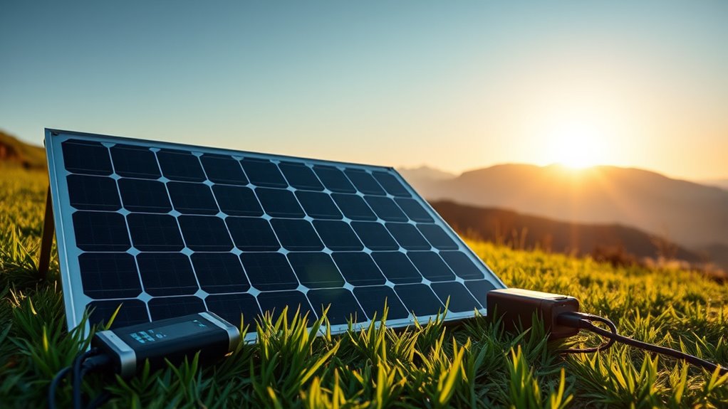 Ease of setup is essential when selecting a folding portable solar panel kit, especially if you want to start generating power quickly and with minimal effort. Look for panels with adjustable stands or kickstands that let you quickly set the ideal angle without tools. Foldable designs that collapse into compact sizes make transportation and deployment hassle-free. Clear, detailed instructions or quick-start guides are invaluable to guarantee straightforward setup. Choosing lightweight panels, often under 20 pounds, reduces effort during installation and enhances portability. Additionally, panels that come with all necessary mounting hardware and connectors simplify the process of positioning and connecting your system. These features combined make setting up your solar kit quick, easy, and less stressful, so you can focus on enjoying off-grid power.