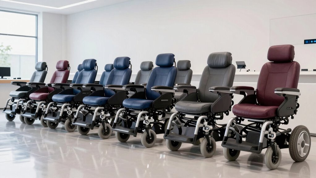 When selecting a folding power wheelchair with a reclining back, safety and stability features should be at the top of your list. Anti-tip wheels are essential to prevent tipping during recline adjustments, especially on uneven surfaces. Electromagnetic braking systems help keep the wheelchair stable when stationary or on inclined terrain. Reinforced frames and anti-rollover mechanisms boost overall safety, particularly when fully reclined. Proper weight distribution and a low center of gravity are vital for stability during movement and reclining. Additionally, secure locking mechanisms for reclining angles prevent unintended shifts, guaranteeing safety during rest or transitions. Prioritizing these features ensures that the wheelchair remains secure, stable, and safe, giving you peace of mind whether you’re resting or traveling.