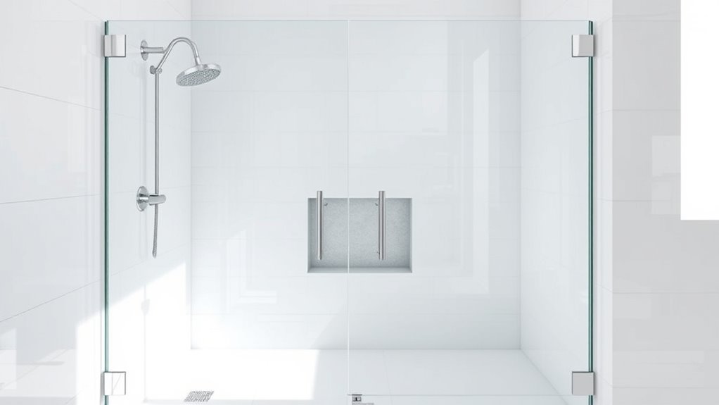 Ever wonder what it takes to keep your frameless glass shower doors looking pristine? With the right care, they can stay sleek and clear for years. Many modern doors feature nano-coatings that resist water spots, soap scum, and stains, making cleaning easier. Regularly cleaning tempered glass with non-abrasive solutions helps maintain clarity and prevent buildup. It’s also important to check seals and tracks periodically for debris or mold to ensure water-tight performance. Using a squeegee after each shower considerably reduces water spots and soap scum accumulation. Additionally, maintaining hardware like rollers and hinges with occasional lubrication keeps everything operating smoothly and prevents corrosion. Proper maintenance not only preserves the look but also extends the lifespan of your shower doors.