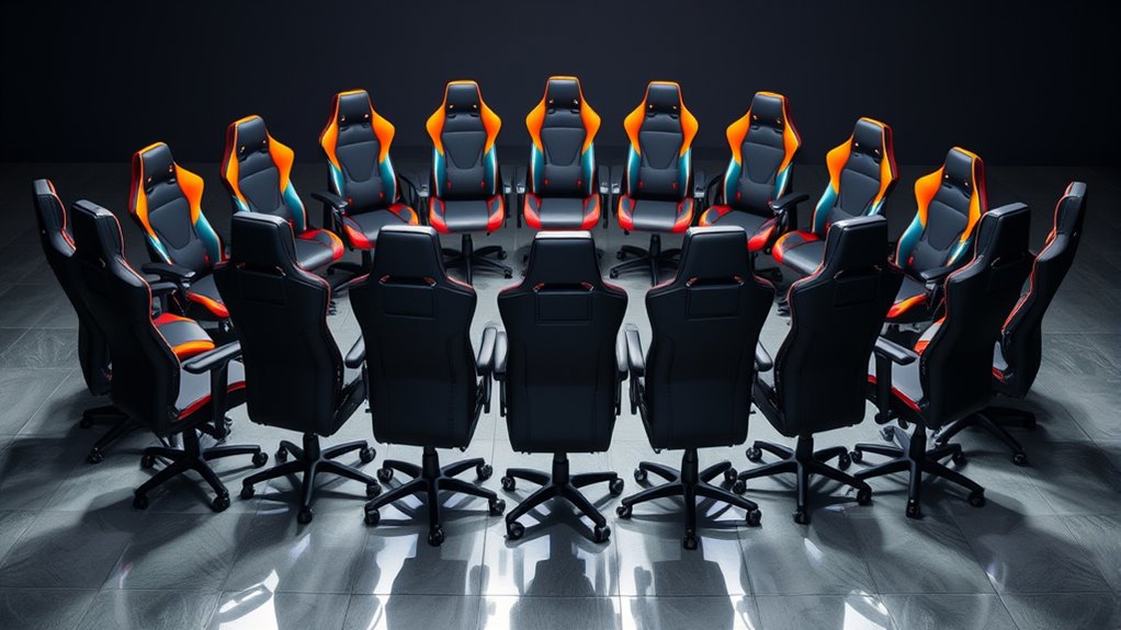 When selecting a gaming chair with lumbar support, it’s vital to pay close attention to its weight capacity. Most chairs are rated between 250 and 400 pounds, designed to suit different body sizes. Choosing a chair that supports your weight guarantees safety, comfort, and durability. Exceeding the specified limit can weaken the frame and compromise safety features, risking damage or failure. Chairs with higher weight capacities often have reinforced frames, heavy-duty bases, and thicker padding, which add to their robustness. Always verify the manufacturer’s specifications before purchasing to make sure the chair can comfortably support you. Regularly reviewing these details helps maintain peak performance and extends the lifespan of your gaming chair, ensuring it remains a reliable part of your setup.