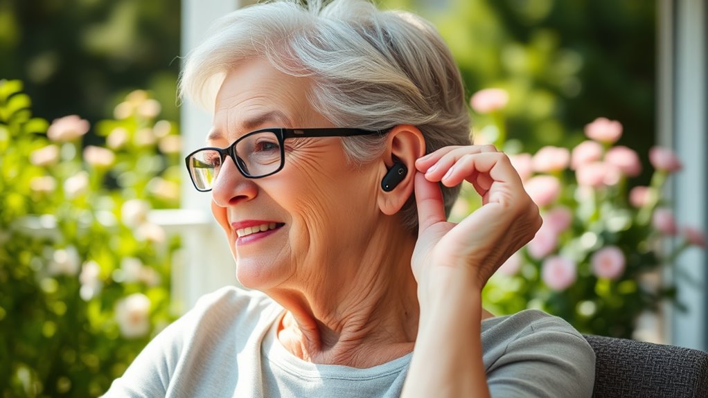 Since many seniors may find complex devices frustrating, prioritizing ease of operation is essential when selecting hearing amplifiers. I recommend choosing models with simple, one-button controls that make adjustments quick and straightforward. Automatic features like auto on/off or auto gain control help minimize manual tweaks, making daily use more convenient. Look for devices with intuitive interfaces, such as tactile dials or touch controls, which require minimal technical knowledge. Preset programs or memory functions are also helpful, as they save your preferred settings for quick activation. Lastly, clear and straightforward instructions or user guides are crucial for hassle-free operation, ensuring seniors can confidently use their hearing amplifiers without confusion or frustration.