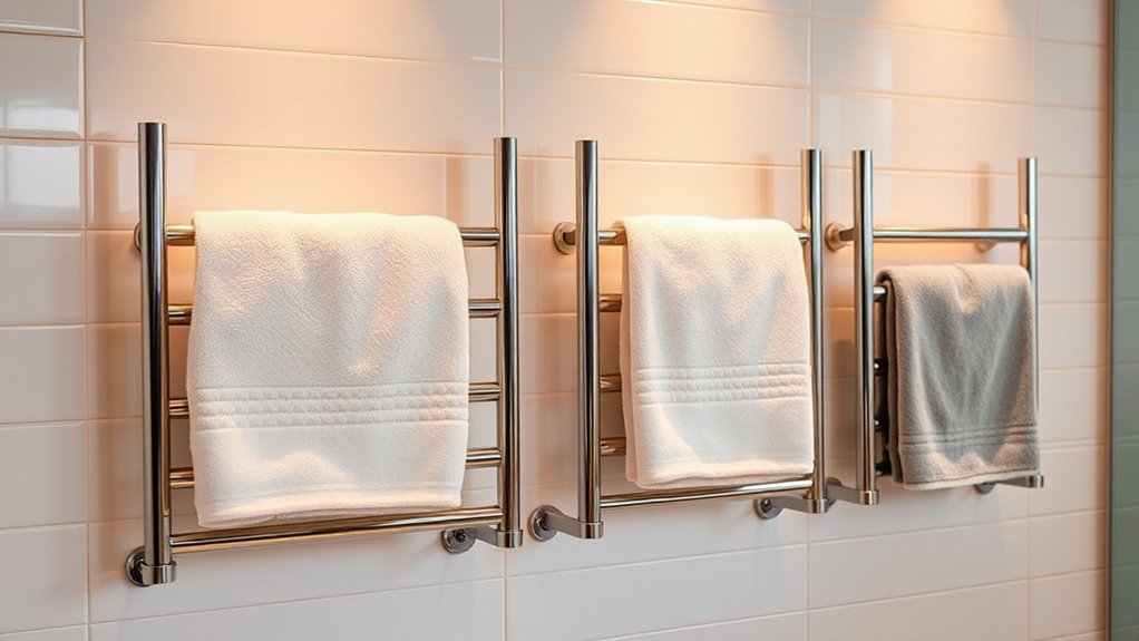 When it comes to temperature control options on hardwired heated towel racks, having precise and reliable settings can make all the difference in comfort and safety. Many models feature integrated thermostats that let you adjust the temperature, usually between 100°F and 160°F, so you can find the perfect warmth. Digital or analog controls make it easy to regulate heat accurately, while some racks offer multiple temperature zones, allowing different towels or garments to be heated to different levels. Automatic thermostats help maintain a consistent temperature, reducing the risk of overheating or energy waste. These built-in controls not only enhance comfort but also improve safety and efficiency, giving you peace of mind with every use.