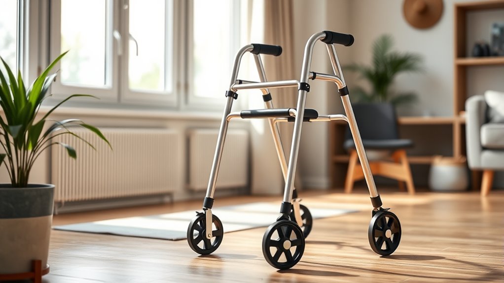 Adjustable height features are essential in hemi walkers because they guarantee a proper fit for users of varying heights. Most models offer adjustments between 28 and 35 inches, ensuring the walker can be tailored to individual needs. Quick and secure options like push-button or snap-pin mechanisms make it easy to change the height as needed. Proper adjustment is vital; it allows your elbows to stay slightly bent at 15-30 degrees, promoting comfort and reducing strain. A personalized fit also improves stability and safety, which is especially important for stroke patients with limited mobility. When the height is right, it helps maintain good posture and prevents unnecessary fatigue. Overall, adjustable height features are key to maximizing both comfort and confidence during use.