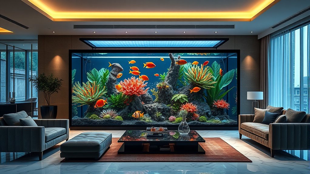 Choosing a high-end fish aquarium involves more than just size and functionality; it’s about creating a stunning visual centerpiece. I look for sleek, modern frames with seamless glass edges that exude luxury. Customizable LED lighting systems with adjustable color and brightness really enhance the tank’s ambiance, highlighting the aquatic life. Artistic design elements like curved or geometric shapes, decorative backgrounds, and integrated filtration concealments add a refined touch. High-quality, crystal-clear glass or acrylic guarantees ideal clarity, making every detail pop. Decorative accents such as built-in LED effects, illuminated substrates, and stylish stands elevate the overall aesthetic. These thoughtful design choices transform the aquarium into a captivating work of art, blending beauty with sophistication and making it a focal point in any space.
