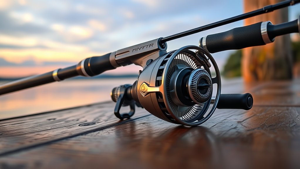Selecting the right reel for your high-end fishing rod combo starts with guaranteeing compatibility across several key factors. First, check that the reel’s line capacity matches your preferred line weight, like 8-14 lbs for inshore fishing. Next, verify the gear ratio; a range of 5.2:1 to 6.2:1 typically suits various techniques and species. It’s also essential to confirm the reel’s drag system is smooth and provides enough stopping power—often over 10 lbs—to handle larger fish. Compatibility of the reel’s mounting system with the rod’s reel seat is vital for secure attachment and balance. Finally, consider the number and quality of bearings, such as sealed stainless steel ball bearings, to guarantee smooth operation and durability during extended use.