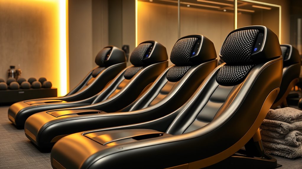 High-end massagers include safety features like automatic shut-off timers, overheating protection, and skin-friendly materials. I appreciate how these features make certain I can relax without worry—especially the auto shut-off that prevents overuse. Many also have adjustable intensity levels, so I can customize my massage without risking discomfort. These safety measures give me confidence, knowing I can enjoy a rejuvenating experience while staying protected.