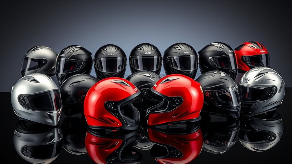 When searching for the 15 best high-end motorcycle helmets, I look for options that combine top safety standards, premium impact-resistant materials, and innovative features like modular designs and integrated Bluetooth. I want helmets that not only pass strict certifications like DOT, ECE, or SNELL but also offer comfort, durability, and versatility to match my riding style. If you’re curious about models with advanced impact protection and stylish finishes, you’ll find plenty of details if you continue exploring further.