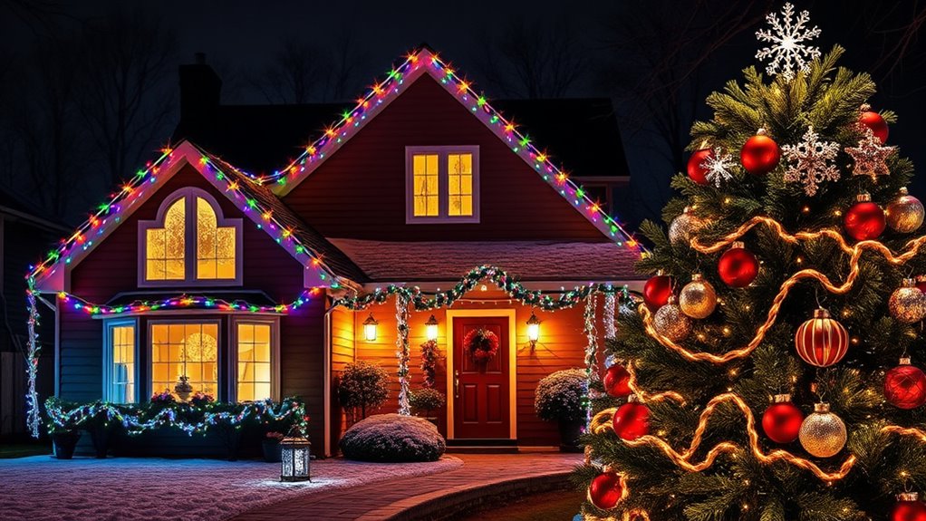 Like a lighthouse guiding sailors home, I believe classic string lights suit traditional brick or wood exteriors, adding warmth and charm. For modern homes with sleek lines, minimalist LED fixtures work best, highlighting clean architecture. Rustic cabins shine with lantern-style lights, while colorful net lights brighten up a festive feel. I recommend matching the style to your home’s architecture for a cohesive, welcoming glow that truly stands out.