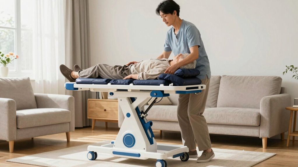 When selecting a home patient lift, ease of use is crucial for guaranteeing caregiver back safety, as complicated or cumbersome equipment can lead to strain or injury. An intuitive interface with simple controls helps prevent operator errors and makes transfers smoother. Lightweight designs with ergonomic handles reduce physical effort during maneuvering and positioning, lowering fatigue. Clear instructions and user-friendly features are essential for confident operation, especially in emergency situations. Quick-release mechanisms and adjustable components streamline the transfer process, saving time and effort. Additionally, accessible training materials ensure caregivers can learn to operate the lift safely and efficiently. Overall, prioritizing ease of use minimizes physical strain, making caregiving safer and less stressful for those providing daily support.