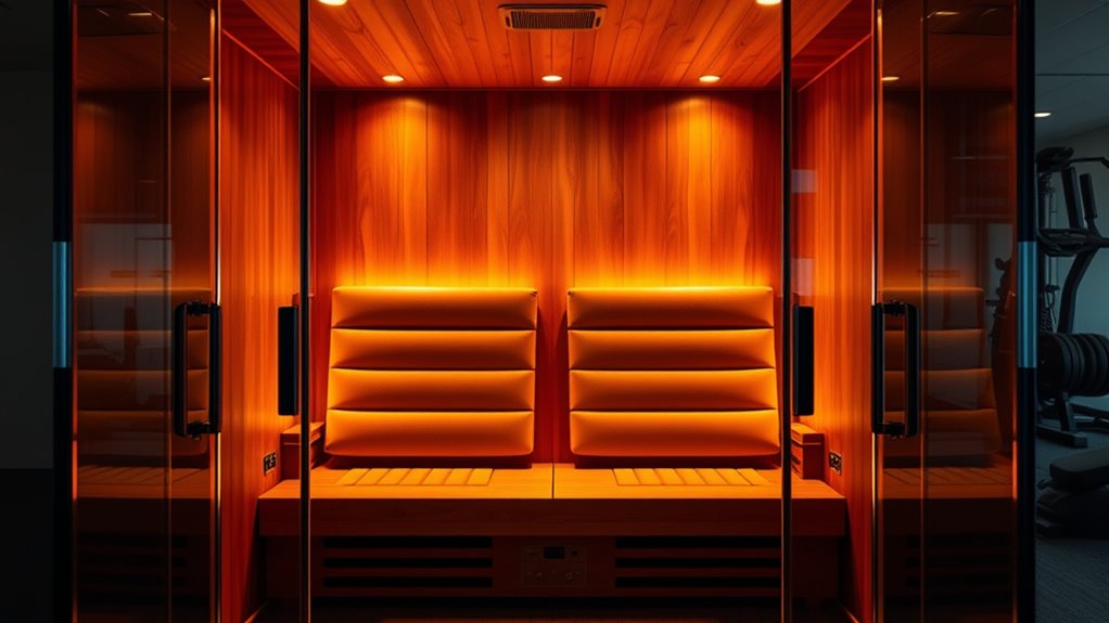 The interior size and layout of an infrared sauna directly impact how comfortably it accommodates 2 to 4 people. Dimensions typically range from about 36×32 inches for 1-2 persons to over 68 inches for 4, ensuring enough space for everyone. Features like built-in benches, adjustable backrests, and ergonomic seating make sessions more comfortable, especially during longer use. Interior lighting options such as chromotherapy or LED ambient lights not only create a soothing atmosphere but also enhance mood. The quality of interior materials, like Canadian hemlock or tempered glass, plays a crucial role in comfort and safety, preventing splinters and providing stability. Extras like towel racks, reading lights, and sound systems personalize the experience, making your sauna sessions more relaxing and enjoyable.
