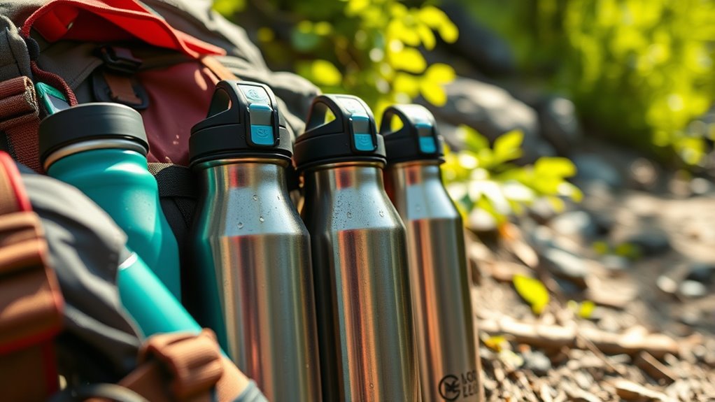 If you’re looking for the best insulated water bottles for hiking, I recommend options like the 40 oz stainless steel bottles with paracord handles, the 32 oz models with straw and handle, or the IRON °FLASK and KXIAOCHEN bottles that keep drinks cold for up to 48 hours or hot for over 12 hours. These bottles are durable, leakproof, and designed for outdoor use. Keep exploring to find out which one suits your adventure style best.