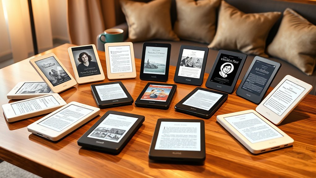 Choosing the right display technology is essential for a satisfying reading experience, especially for avid book lovers. High-resolution displays with 300 ppi, like those on Kindle Paperwhite models, offer sharp, paper-like text clarity that makes reading comfortable for hours. Glare-free screens are vital for outdoor reading, reducing eye strain and ensuring visibility in bright sunlight. Advanced technologies such as e-ink and color e-ink provide high contrast and vibrant images, elevating the overall experience. Features like adjustable warm light and contrast settings let me customize the display for different lighting conditions, maintaining readability day or night. Larger screens with faster refresh rates and high contrast ratios create a seamless, natural feel that closely mimics real paper, making every page turn a pleasure.