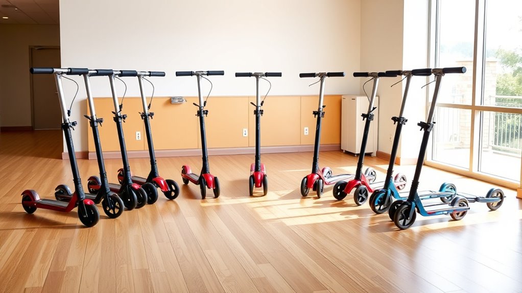 When selecting a knee scooter, understanding how price relates to value is essential for making a smart investment. Prices range from around $100 for basic models to over $300 for premium versions, so it’s important to consider what features you truly need. Higher-priced scooters often include adjustable handlebars, better weight capacity, and improved suspension, which can offer better long-term value. Comparing materials and durability helps determine if the extra cost is justified by increased longevity and performance. Keep in mind that cheaper models might lack safety features like dual brakes, impacting safety and overall value. Choosing a scooter with features suited to your recovery needs ensures you get the best balance of cost, safety, and comfort, ultimately saving you money and enhancing your mobility.