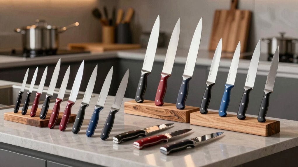 When evaluating knife sets under $300, it’s vital to take into account their versatility and range to make sure they can handle a variety of kitchen tasks. A well-rounded set should include essential blades like chef’s, paring, utility, bread, and slicing knives, allowing for smooth progression between prep work, slicing, and intricate cuts. Sets that feature specialized knives, such as a Santoku or fillet knife, add extra adaptability for specific cuisines and techniques. Having different handle styles and blade configurations guarantees peak performance across various culinary applications. This broad range maximizes both value and functionality, letting you tackle everything from everyday tasks to more detailed cooking with just one set, all within a $300 budget.
