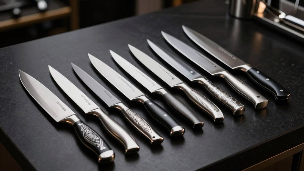 Blade material subtly influences a knife’s lifespan and how well it maintains its edge. High-quality steels, like VG-10 or Damascus, tend to stay sharp longer and resist wear, giving you consistent precision. Softer metals might need more frequent sharpening, but can be easier to hone. Choosing the right blade material means you’ll enjoy sharper cuts and longer-lasting performance, making every kitchen task a little more effortless and enjoyable.