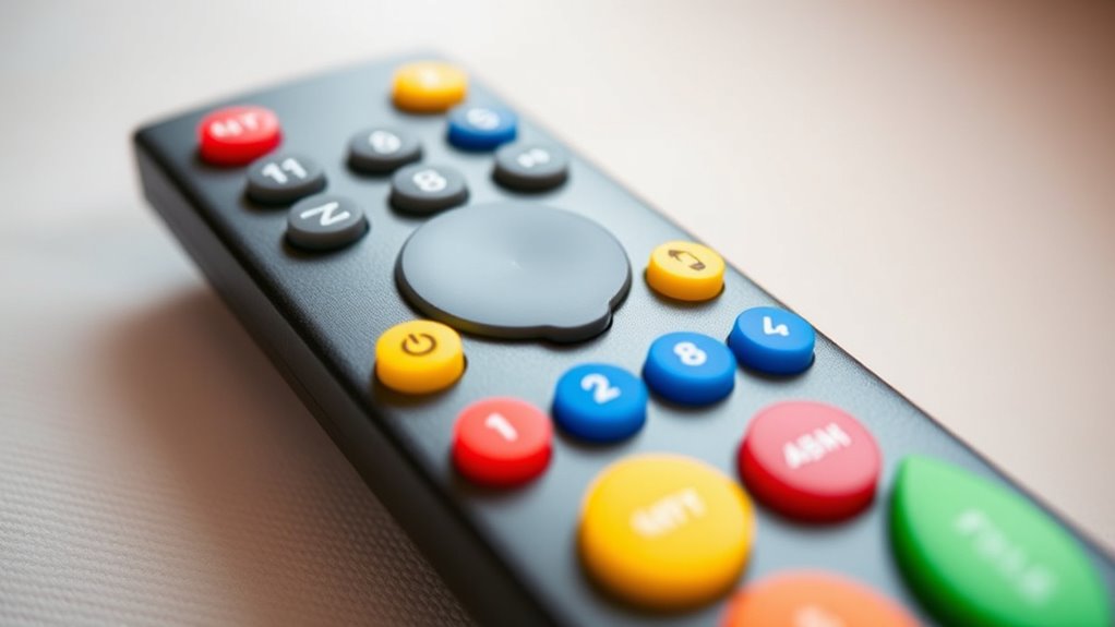 A remote’s user-friendliness plays a vital role in guaranteeing seniors can operate their devices comfortably and confidently. Large buttons with clear labels and tactile feedback make pressing easier and help prevent mistakes, especially for those with visual impairments. Simplified layouts with minimal functions reduce confusion, allowing for quick learning and straightforward use. An intuitive setup process, like step-by-step instructions or automatic code search, minimizes frustration and saves time. Features such as glow-in-the-dark keys improve usability in low-light conditions, making nighttime operation easier. Ergonomic designs that fit comfortably in the hand prevent slips and reduce fatigue, even after extended use. When choosing a remote, prioritizing these user-friendly features ensures a more enjoyable and accessible experience for seniors.