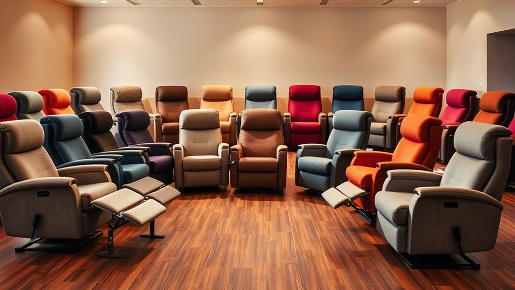 When selecting a lift chair, ease of operation is crucial to guarantee a comfortable and frustration-free experience. I look for chairs with intuitive remote controls that feature large buttons and simple functions, making adjustments effortless. Smooth, quiet power lift mechanisms are essential, so I avoid models that require manual effort or produce noise. Clear labeling of functions helps prevent confusion, especially for users with limited technical skills or elderly family members. Adjustable and programmable settings are also a plus, allowing quick customization with minimal effort. Safety features like emergency stop buttons and automatic return to neutral positions add peace of mind and simplify use. Overall, a lift chair with straightforward controls and reliable mechanisms ensures a seamless, comfortable experience every time.