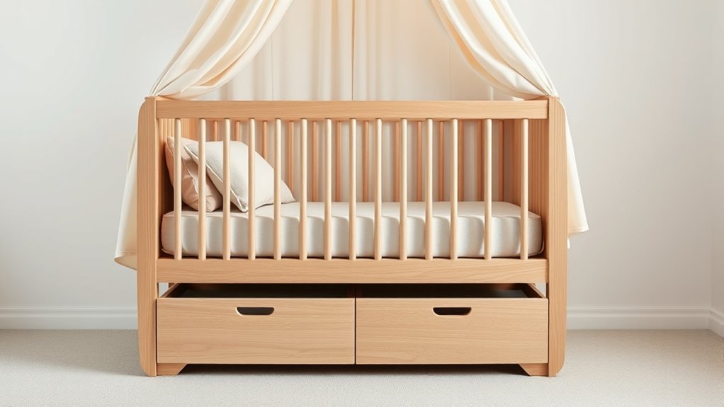 Choosing the right materials is essential for ensuring your luxury convertible crib is both safe and durable. I look for cribs made from high-quality, non-toxic materials like solid hardwoods—maple, oak, or sustainably sourced pine—that stand up to daily use. Premium finishes, like Greenguard Gold certified coatings, guarantee low emissions and a safer environment for your little one. I also prioritize smooth surfaces with minimal joints, which prevent splinters and enhance longevity. Superior materials not only improve stability but also support children up to 50 pounds or more, offering peace of mind as they grow. Additionally, eco-friendly, sustainably sourced options reflect a commitment to environmental responsibility, ensuring safety for your child and the planet.