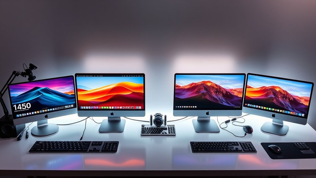 When configuring your Mac Studio, it’s essential to guarantee that it can support your desired display setup. First, check that your chosen configuration can handle high-resolution displays like 6K or 8K at 60Hz without issues. Make sure the available ports—Thunderbolt 4, HDMI, or DisplayPort—can connect your monitors and support their resolution and refresh rate. Verify that the hardware supports multiple displays simultaneously, including the maximum number and resolution for each screen. Additionally, confirm that media engines and video decoding capabilities are compatible with your display formats and HDR standards. If your monitors don’t natively support Thunderbolt, HDMI, or DisplayPort, consider whether adapters or dongles are necessary. Ensuring these factors are aligned guarantees a seamless, high-quality visual experience.