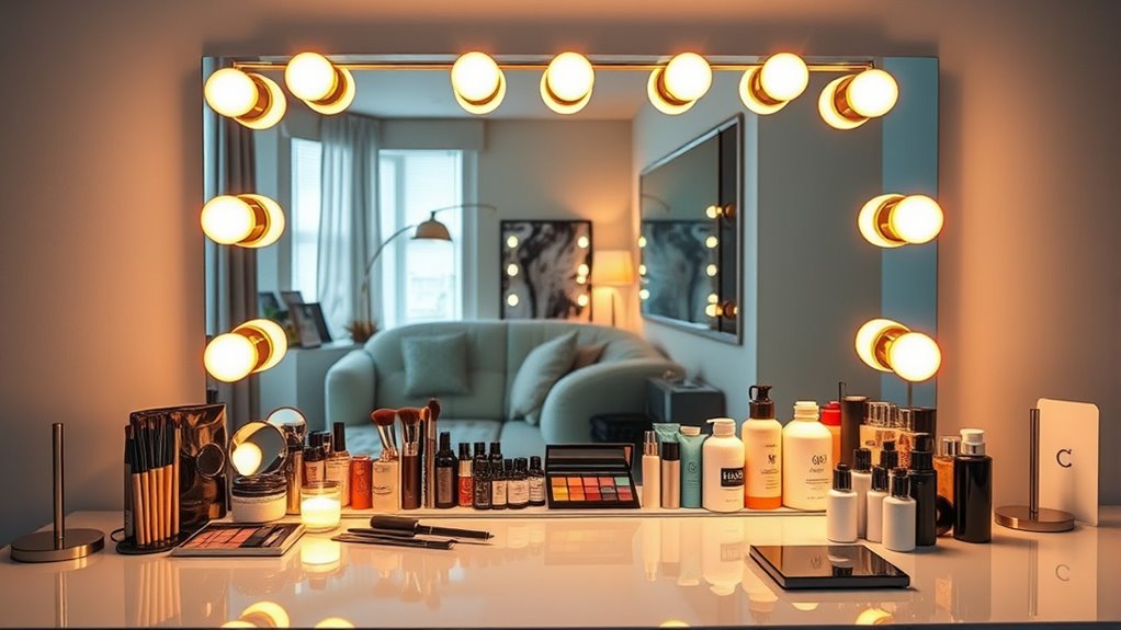 Choosing the right makeup mirror with lights means paying close attention to its brightness adjustment options. I look for mirrors that offer adjustable brightness levels, ideally with touch sensors or dimmer switches for precise control. Multiple lighting modes, such as white, warm, and natural light, are essential to adapt to different makeup needs. I also prefer models with memory functions that remember my favorite brightness setting for convenience. Energy-efficient LED lights with long lifespans—up to 50,000 hours—are a plus, ensuring durability and savings on replacements. Seamless and responsive brightness adjustments are vital, so I can smoothly transition between different intensities without hassle. These features help create the perfect lighting environment for flawless makeup application every time.