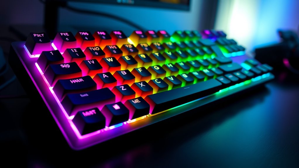 Choosing a mechanical keyboard with great customization capabilities means looking beyond just the switch types; it involves evaluating features that let you personalize your experience. Hot-swappable switches are a game-changer, letting me easily swap out or upgrade switches without soldering. Programmable keys and macro functions enable me to create shortcuts or gaming commands tailored to my needs, boosting efficiency. RGB backlighting with customizable effects and per-key color adjustments allow me to set the perfect aesthetic. Software support is essential, as it helps me create and save profiles, macros, and lighting schemes effortlessly. Additionally, compatibility with various keycap sets and the ability to modify key functions or layouts give me full control over my keyboard’s look and feel. Personalization truly elevates my typing and gaming experience.