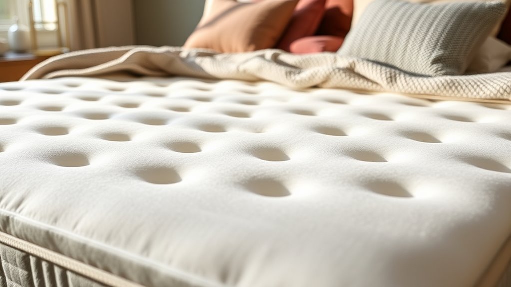 Memory foam mattresses under $500 often feature layered designs that boost support and pressure relief by evenly distributing your body weight. The right firmness level, usually medium or medium-firm, ensures solid support without sacrificing comfort. Zoned support technology may be included to target areas like the lumbar region, promoting proper spinal alignment and easing pressure points. The foam’s density, typically between 3 to 5 pounds per cubic foot, directly affects how well the mattress contours to your body and relieves pressure. Additionally, proper edge support and reinforced corners help maintain support across the entire surface, preventing sagging and ensuring consistent comfort. These features work together to provide a balanced sleeping experience, making affordable memory foam mattresses a practical choice for quality support and pressure relief.
