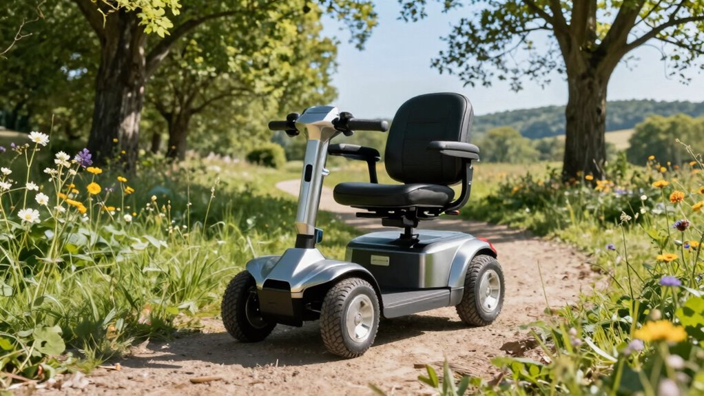 Ensuring safety and stability on grass trails requires paying close attention to specific features in a mobility scooter. I look for models with large, all-terrain tires—8 inches or bigger pneumatic tires—that provide better grip and balance on uneven surfaces. High ground clearance, around 3 inches or more, helps prevent the undercarriage from catching on rough terrain. A full suspension system or dual shock absorbers is essential to absorb bumps and keep the ride smooth. To improve stability, I choose scooters with anti-tip wheels and a low center of gravity, reducing the risk of tipping over on uneven ground. Additionally, safety features like bright LED headlights, rearview mirrors, and reliable brakes give me confidence while orienting myself on outdoor terrains, ensuring a safer and more secure experience.