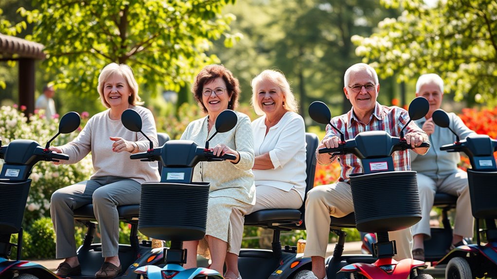 If you’re searching for the best mobility scooters for short seniors that blend comfort and convenience, I’ve found options with long ranges of 15 to 30 miles, lightweight and foldable designs, and features like LED headlights and detachable baskets. These models offer stability, adjustable seats, and smooth rides on various terrains. Keep exploring to discover the top choices that will help you stay active and independent every day.