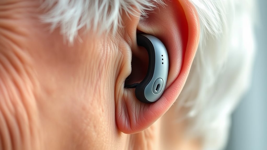 I’ve noticed that the latest hearing aids prioritize comfort with lightweight, ergonomic designs that fit snugly without causing irritation. New materials like soft silicone and customizable molds make a huge difference, especially for sensitive skin. Features like moisture-resistant coatings and adjustable settings also help me wear them longer without discomfort. Overall, these innovations guarantee I can enjoy clear sound without sacrificing comfort, making everyday conversations much easier.