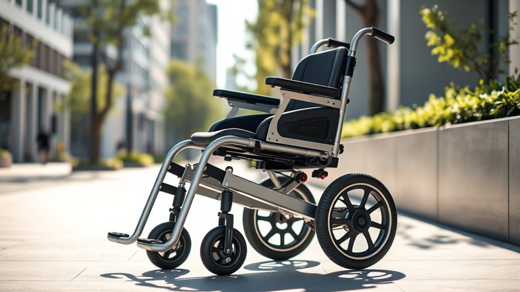 Choosing a compact electric wheelchair hinges on how easily it folds and its overall portability, since these features directly impact whether I can take it on trips or store it conveniently. A one-step foldable design makes storage and transport quick and effortless, saving time and effort. Lightweight frames, especially those made from aerospace-grade aluminum or alloys, enhance portability without compromising strength. Folded dimensions should be small enough to fit into car trunks, airplane compartments, or tight storage spaces, making travel hassle-free. Removable or foldable armrests and footrests further reduce the profile, adding convenience. Ideally, the wheelchair weighs under 40 pounds—some models as light as 30 pounds—so I can easily lift and carry it without strain. These features ensure maximum portability and ease of use wherever I go.