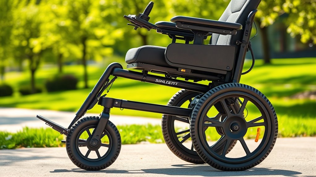 Battery life longevity guarantees you’ll enjoy extended use and dependability, but durability features of the wheelchair itself play a vital role in maintaining that reliability over time. Reinforced frames made from aerospace stainless steel or high-strength aluminum alloys ensure the structure withstands daily wear and tear. Puncture-resistant tires with superior shock absorption allow smooth travel across various terrains, reducing potential damage. Anti-tip wheels and electromagnetic brakes add stability, preventing tipping and sudden stops that could harm components. Heavy-duty construction supports weights of 300 pounds or more, accommodating diverse user needs without compromising durability. Additionally, reinforced joints, high-quality wiring, and robust motor mounts prevent mechanical failures, extending the wheelchair’s lifespan. These features collectively guarantee your wheelchair remains reliable and durable through daily use.