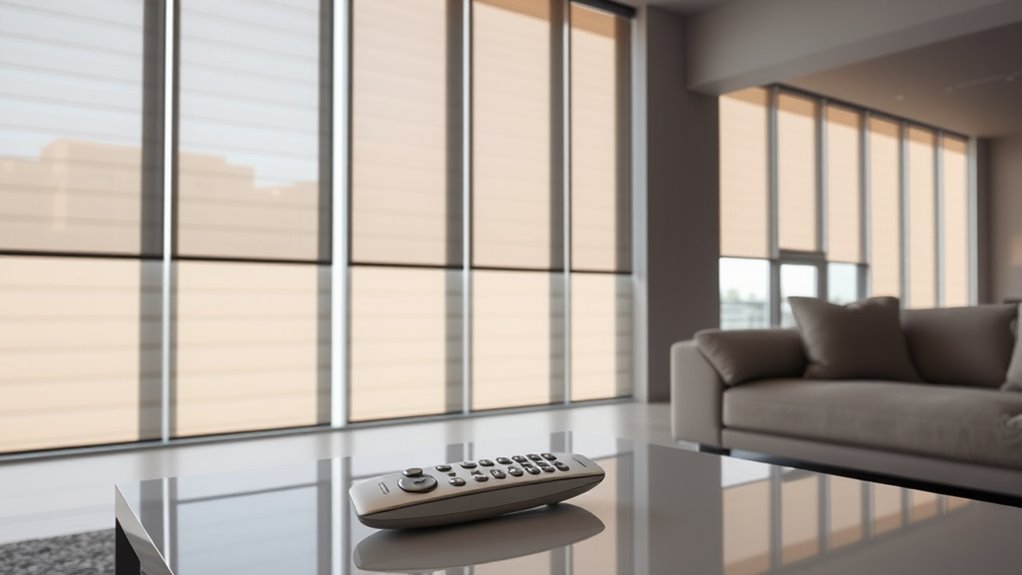 Solar-powered motorized blinds are like a revitalizing change for energy efficiency—they can notably cut your energy bills. I’ve found that their solar panels efficiently harness sunlight, reducing reliance on grid power, especially when used with good insulation. While their efficiency varies based on sunlight exposure and installation, they generally offer a sustainable, eco-friendly solution that helps keep your home cooler in summer and warmer in winter.