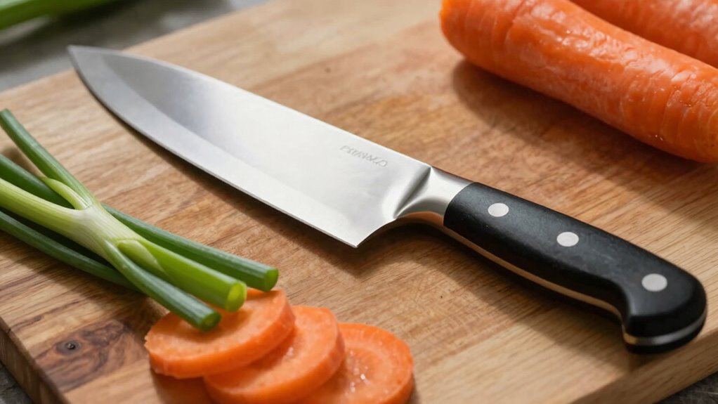 I find that handle materials like pakkawood, composite, and textured rubber give the best grip and comfort. Pakkawood offers a natural feel, while composite handles are durable and water-resistant. Textured rubber handles provide excellent grip even when wet, reducing slips and increasing safety. I recommend choosing a handle material that feels comfortable in your hand and suits your cooking style, ensuring you can work efficiently and comfortably for hours.
