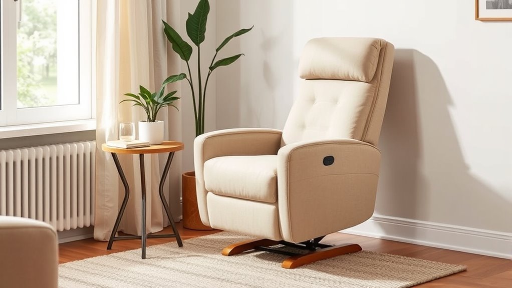 Imagine slipping into a cozy, perfectly fitted chair that not only supports you but also keeps you safe—small-space lift chairs often come with helpful safety features. I’ve seen models with low-profile designs, sturdy anti-tip mechanisms, and emergency release cords. These features give me peace of mind, knowing I won’t worry about tipping over or getting stuck. Safety is essential, especially in compact spaces where every move counts.