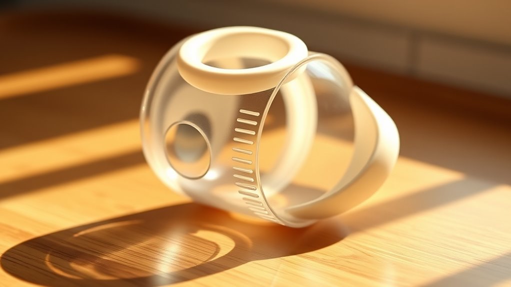 The spill-resistance of no-spill cups hinges on the quality of their sealing mechanisms, such as silicone lids and locking closures. A well-designed seal prevents leaks even if the cup is turned upside down or shaken. Cups with adjustable flow control or controlled-sip features help limit liquid release, reducing accidental spills. Leak-proof and one-way valves further enhance spill resistance by stopping liquid from escaping during tipping or shaking. The material’s flexibility and the precision of the closure system also play vital roles in maintaining a tight seal during daily use. When selecting a cup, look for these features to guarantee maximum spill resistance, giving both you and your loved ones confidence that spills will be minimized, no matter the situation.