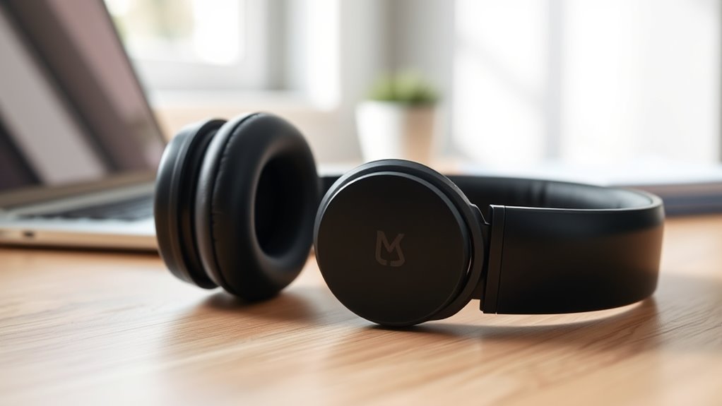 Durability is a crucial factor because remote work often involves daily commuting, long hours, and occasional mishandling. I recommend choosing headphones built from high-quality materials like reinforced plastics, metal alloys, or premium leather to withstand wear and tear. Look for reinforced joints, sturdy headbands, and impact-resistant ear cups—these features help them survive drops and rough handling. Water and sweat resistance ratings, like IPX4 or higher, protect against moisture damage during workouts or humid environments, extending their lifespan. A robust build also ensures consistent noise cancellation over time, preventing issues caused by loose components or internal damage. Investing in well-made headphones with reinforced cables, secure hinges, and quality stitching can greatly increase durability, making them a reliable companion for your remote work routine.