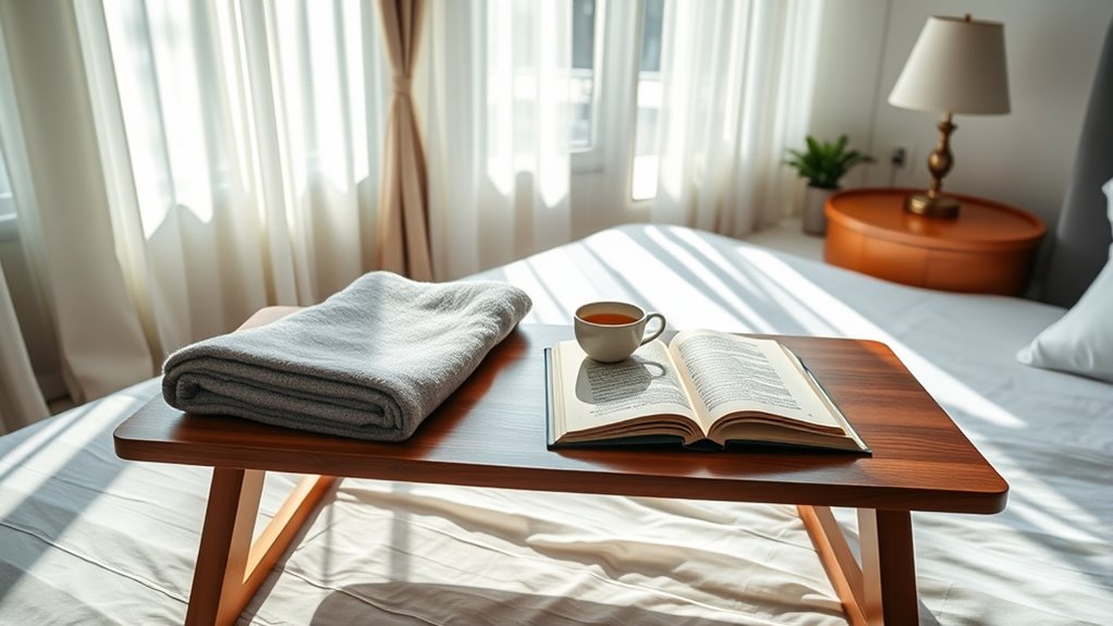 Choosing an overbed table with height adjustability is vital for guaranteeing comfort and usability. I recommend looking for tables that have a wide adjustable range, typically from around 26 inches to over 40 inches, to fit various bed heights and personal preferences. A pneumatic or spring-loaded lift system makes for smooth, one-handed adjustments, which I find incredibly convenient. It’s also essential to check that the locking mechanism securely holds the table at the desired height, preventing any unintended movement while I’m using it. I prefer tables that allow for quick adjustments—ideally in less than 10 seconds. Finally, confirm the adjustment system is durable and stable over time, so I don’t have to worry about wobbling or slipping during use.