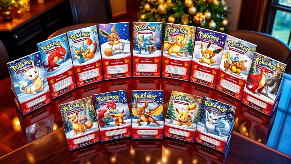 Most holiday calendars in 2025 include rare or limited-edition Pokémon cards, making them perfect for collectors and trainers alike. I’ve found that calendars from major brands often feature exclusive promo cards that aren’t available elsewhere, adding extra excitement to the season. Keep an eye out for special editions that highlight unique artwork or rare Pokémon, and you’ll be delighted with what you uncover in these festive packs.