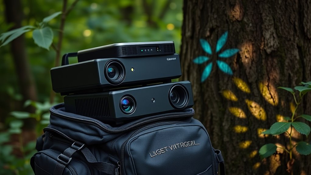 As I pack my portable projector into a small bag, I realize how these tiny devices turn any dull wall into a vibrant screen, like a secret cinema hiding in my pocket. Their compact size feels almost like a mirage amidst the chaos of travel, yet they deliver stunning visuals, making every adventure unforgettable. These projectors blend portability with power—proof that even the smallest gadgets can create big moments wherever I go.