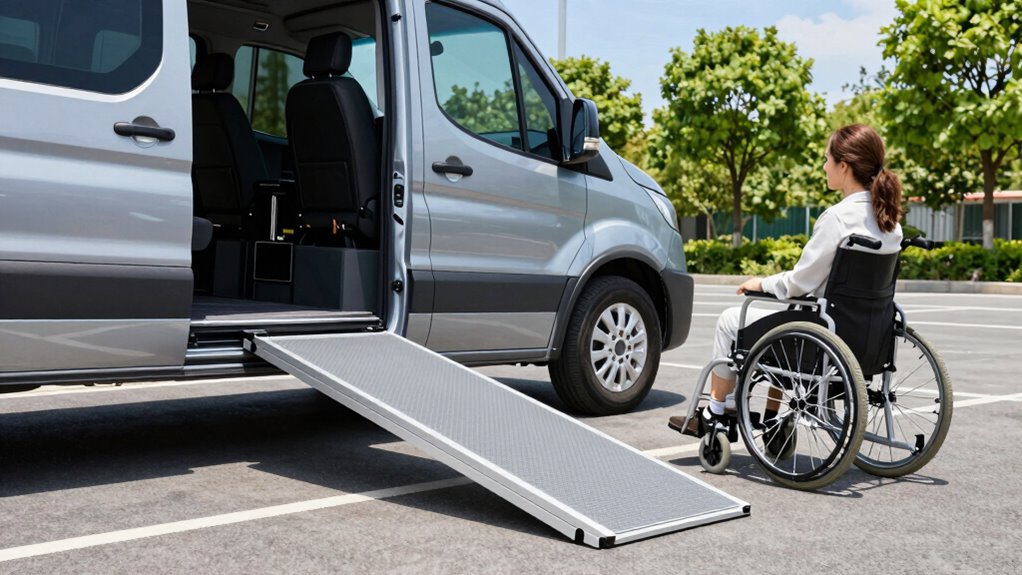 Choosing a portable wheelchair ramp that fits your van requires paying close attention to compatibility factors. First, verify the ramp’s length matches your vehicle’s entry height to create a safe, manageable incline. Next, check that its weight capacity supports the combined weight of the user, wheelchair, and any additional gear. The ramp’s width should accommodate your wheelchair’s base and any side supports or anti-tip features. It’s also essential to confirm compatibility with your vehicle’s door types and entry points, whether side or rear doors, for a proper fit. Finally, consider how the ramp attaches or mounts to your van; secure mounting options are vital for safety and stability during use. Taking these factors into account helps guarantee a seamless, safe transition into your vehicle.