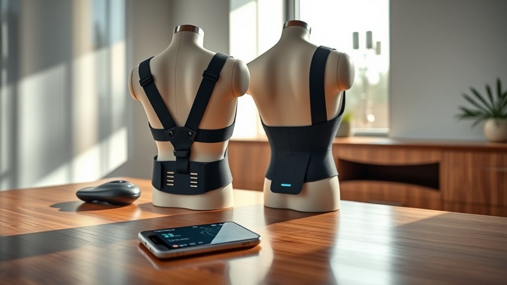 Modern posture-correcting devices leverage advanced sensors like angle and tension monitors to track your posture in real time, providing immediate feedback to help you stay aligned. Features such as vibration alerts and automatic posture detection make it easy to recognize when you’re slouching or misaligned. Many devices seamlessly integrate with companion apps, allowing you to monitor progress, set goals, and access personalized training programs. Adjustable correction angles and elastic straps enable customization for different body types and support needs, ensuring comfort and effectiveness. Some models even include automatic memory functions and posture analysis tools to offer deeper insights into your habits. Overall, these technological features help you develop better posture habits with minimal effort, making them essential factors when choosing the right device.