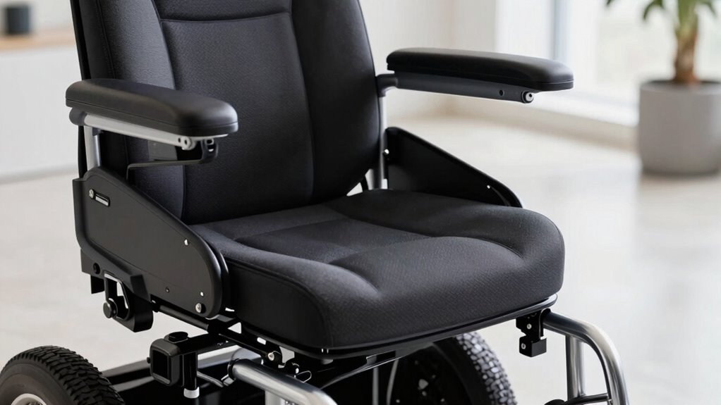 When selecting a power wheelchair with a pressure relief cushion, I focus on how easy it is to keep the cushion clean and well-maintained. I look for cushions with removable, machine-washable covers to make cleaning simple. Ensuring the cushion’s materials are waterproof or spill-resistant helps prevent damage and makes wiping down quick and effortless. I prefer cushions with quick-inflate or self-inflating features, which save time and reduce setup hassle. Durability matters too—high-quality fabrics that resist wear and tear will last longer and maintain their comfort. Finally, I choose cushions with straightforward fastening mechanisms like adjustable straps or anti-slip bottoms for secure, easy repositioning. These features help keep maintenance simple, ensuring the cushion remains hygienic and functional.