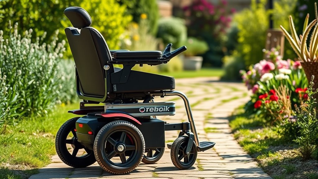 Traversing diverse outdoor terrains requires a power wheelchair that can handle uneven surfaces with confidence. I recommend looking for models equipped with all-terrain tires, like puncture-proof PU or inflatable options, to guarantee stability on grass, gravel, or sand. It’s also important to choose a wheelchair that supports slopes of at least 12°, allowing safe navigation of inclines. A robust suspension system or shock absorbers can absorb shocks, providing a smoother ride across rough terrain. Adjustable or anti-tip wheels enhance safety when crossing uneven ground or slopes. Finally, check that the wheelchair’s weight capacity and motor power are sufficient to handle outdoor environments without sacrificing performance. These features combined will give you the confidence to explore various terrains safely and comfortably.