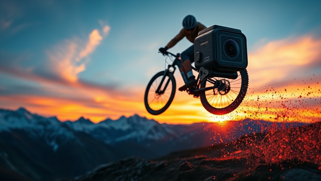 Durability and waterproofing are essential factors because they determine whether your action camera can withstand the rigors of intense sports and harsh environments. A high-quality premium camera should be waterproof up to at least 30 meters (98 feet) to handle underwater adventures and rainy conditions. Look for an IP68 rating or higher, which means the device is fully sealed against water ingress during immersion. Rugged construction, shock resistance, and reinforced housing ensure your camera survives impacts, drops, and rough handling. Weather-resistant materials and sealed ports add to its longevity in extreme conditions. For added protection, consider waterproof cases or enclosures, which can extend waterproofing and safeguard against physical damage, giving you peace of mind during your most demanding activities.