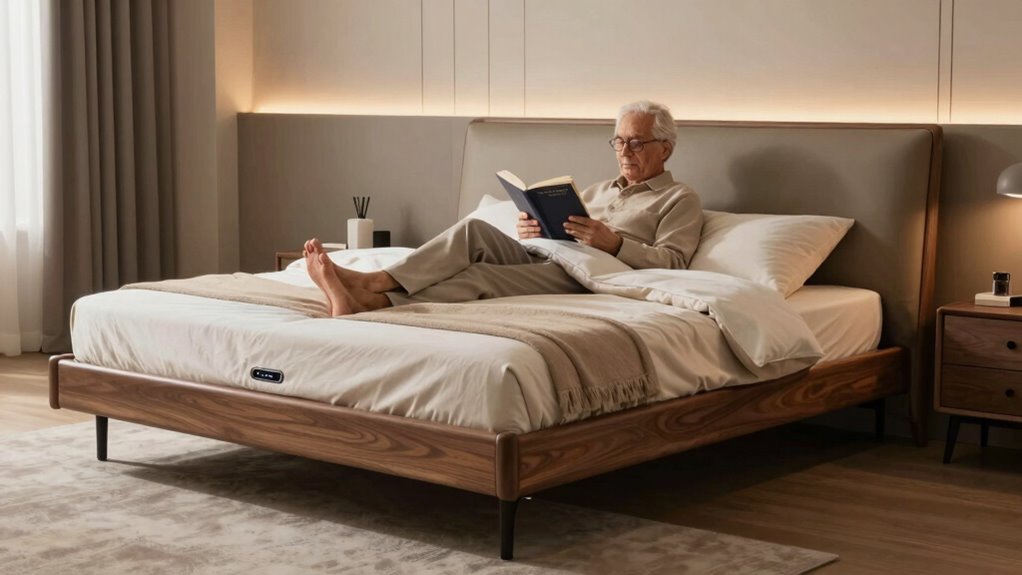 Imagine a senior easily adjusting their bed with a simple remote—this is thanks to safety features like emergency stop buttons. These are vital because they prevent accidents if the bed moves unexpectedly. Many premium adjustable beds include lockable controls, anti-slip bases, and automatic shut-off systems. These features guarantee users can operate their beds confidently and safely, giving peace of mind for both seniors and their loved ones.