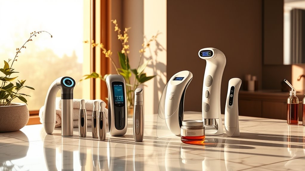 After considering portability and design, ease of use becomes a key factor in selecting premium anti-aging facial devices. I always look for devices that feature intuitive controls, like single-touch operation or clearly labeled buttons. This guarantees I can easily navigate through settings without frustration. Minimal setup requirements, such as pre-charged units or automatic activation, also simplify my treatment sessions. I prefer devices that offer adjustable settings with clear indicators, allowing me to customize intensity as needed. Ergonomic designs with comfortable grips make handling effortless during use. Plus, I appreciate devices with guided instructions, automatic shut-off timers, or app integration to enhance my confidence and streamline my skincare routine. These features make my anti-aging journey much smoother and more enjoyable.