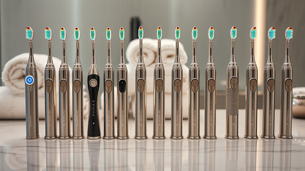 Having multiple brushing modes in a premium electric toothbrush allows me to customize my oral care routine to suit my specific needs. With options like whitening, polishing, gum care, sensitive, and deep clean, I can target particular concerns and enhance my overall oral health. These specialized modes often include timers and adjustable intensities, helping me control brushing duration and pressure for safety and effectiveness. They also make daily brushing more comfortable, especially if I have sensitive gums or teeth. Advanced models even incorporate smart technology, like vibration timers and mode memory, to ensure consistent cleaning. This variety makes it easy to personalize my brushing experience, guaranteeing I get a spa-like clean tailored exactly to my dental needs.