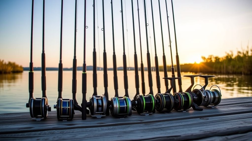 Since the weight and balance of a fishing combo directly affect comfort and performance, I always pay close attention to how evenly the rod and reel distribute their weight. A well-balanced setup reduces fatigue, allowing me to fish longer without strain. Lighter combos are ideal for extended sessions and delicate presentations, as they improve maneuverability and responsiveness. Proper weight distribution also boosts sensitivity, helping me feel bites more clearly and react quickly. The balance point, usually near the reel seat, influences casting distance and accuracy—an evenly balanced combo casts smoother and more precisely. Conversely, heavy or poorly balanced gear can cause wrist strain and make control harder, ultimately hindering my technique and enjoyment on the water.
